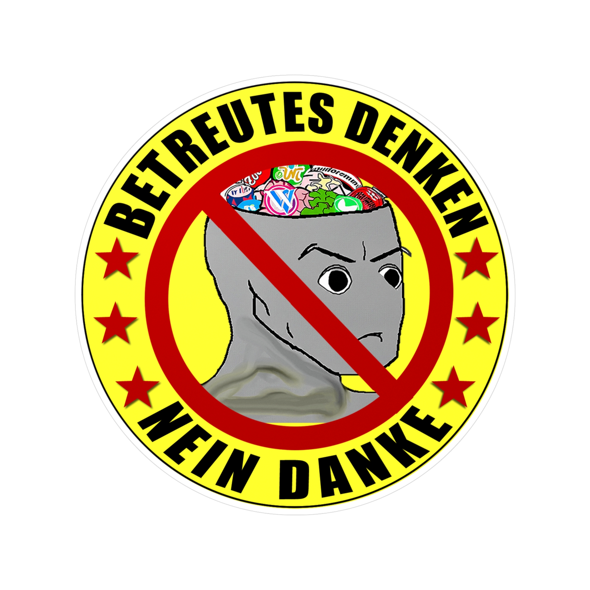 **Design:** Runder Sticker mit auffälligem „Betreutes Denken – Nein Danke“ Aufdruck.